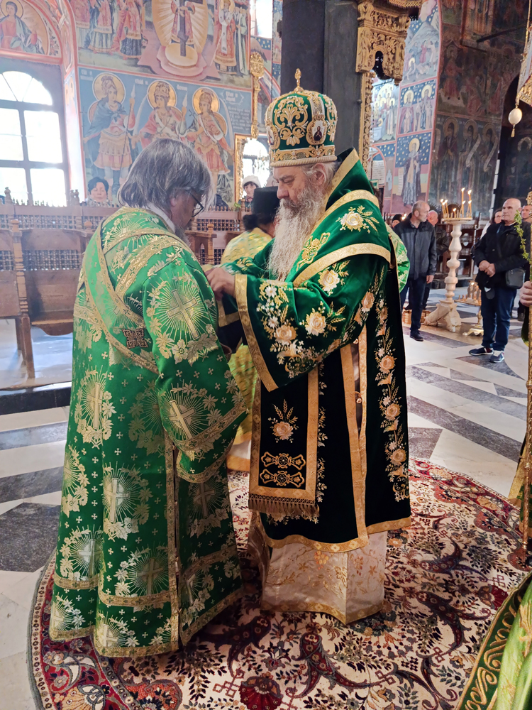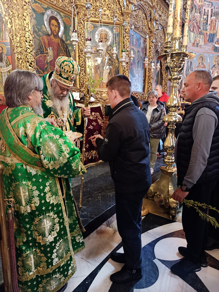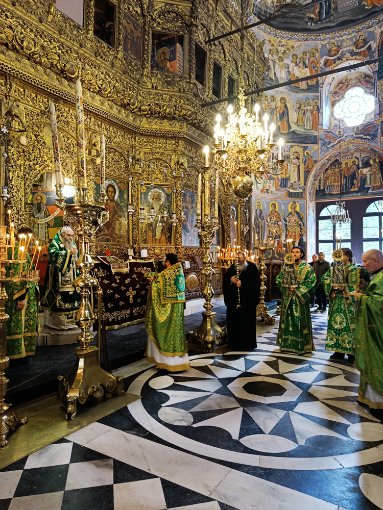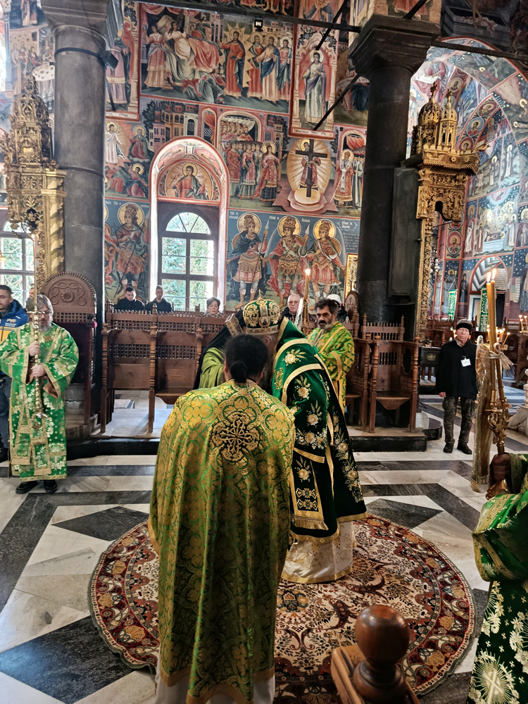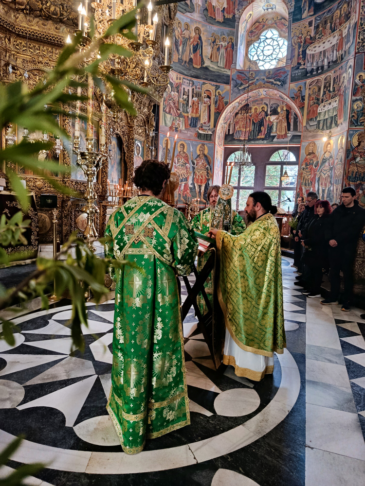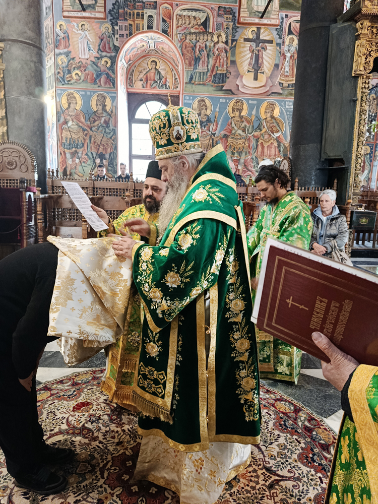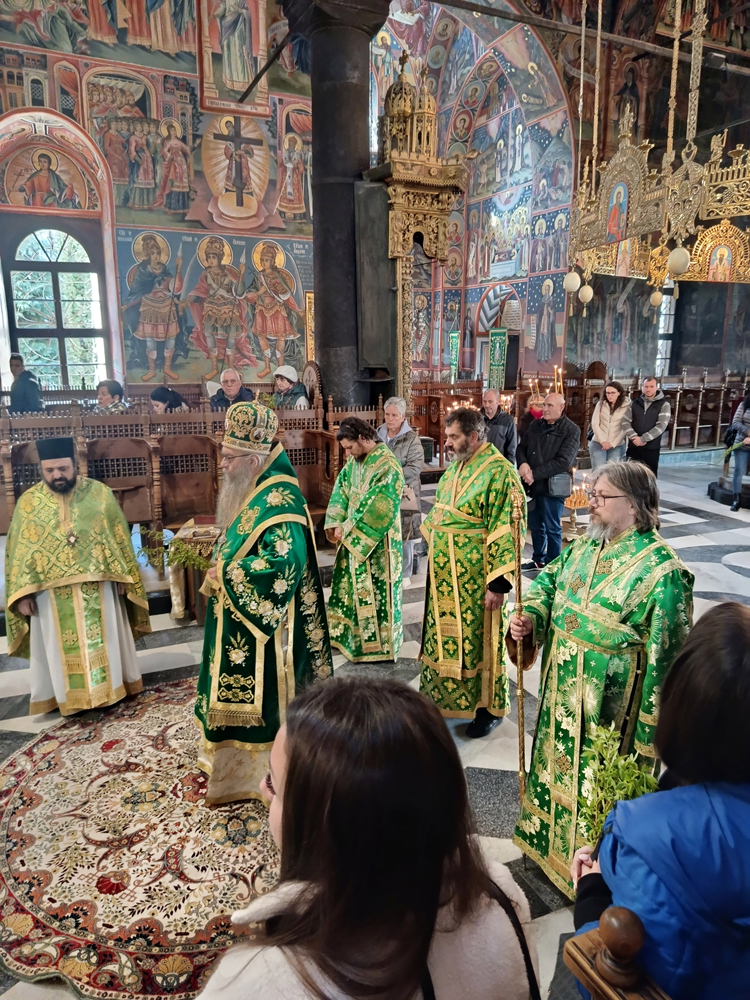 Днес, Неделя Вайя, тържествената богослужба в Рилската света обител бе предстоявана от игумена Адрианополския епископ Евлогий, в съслужение с братството на манастира.
