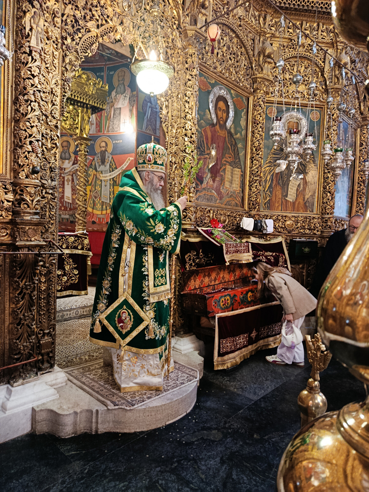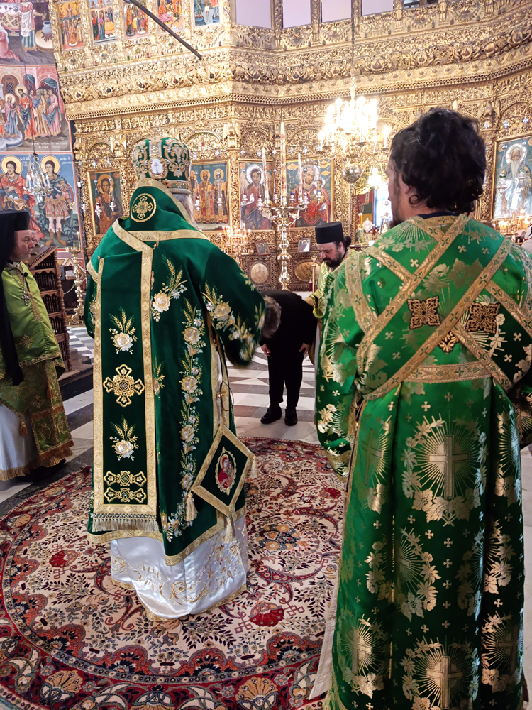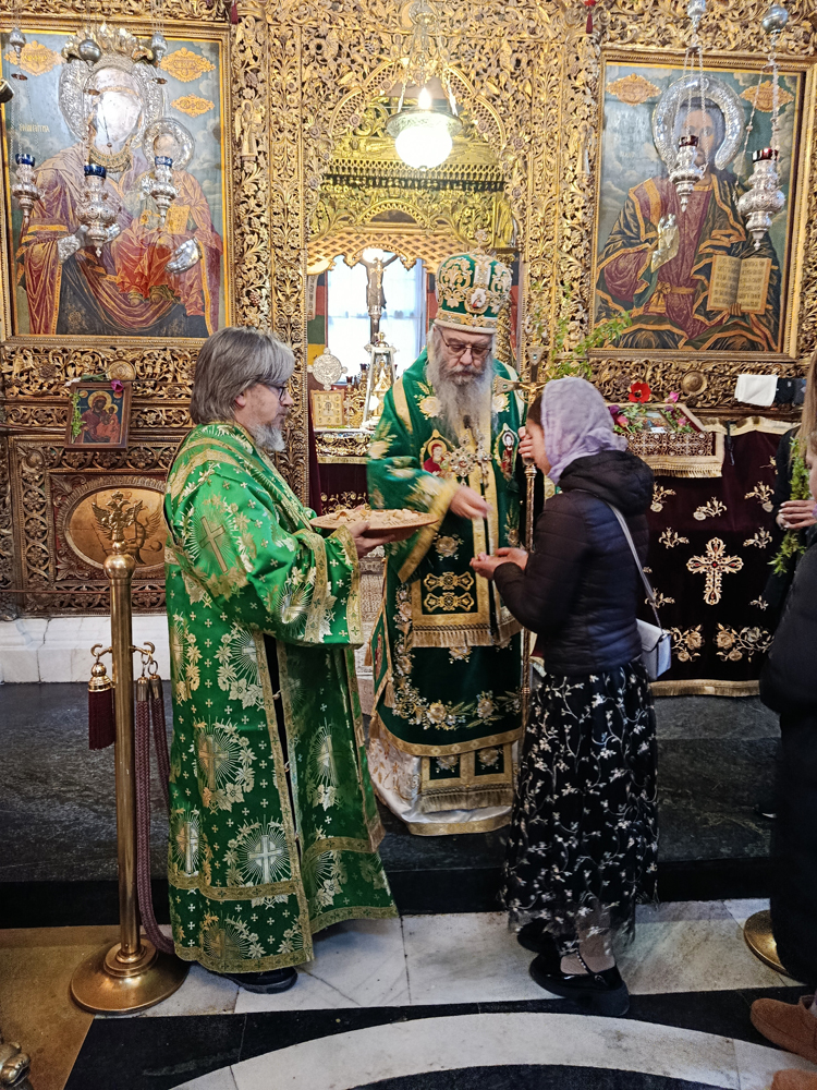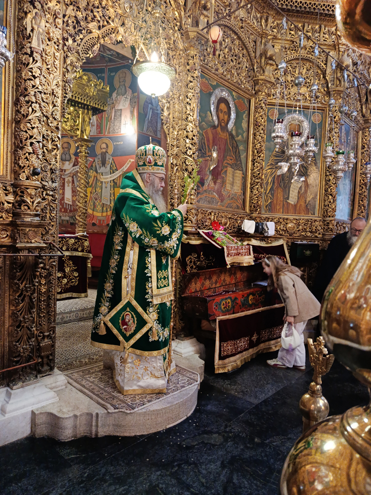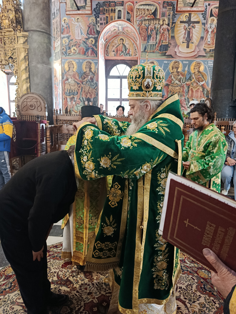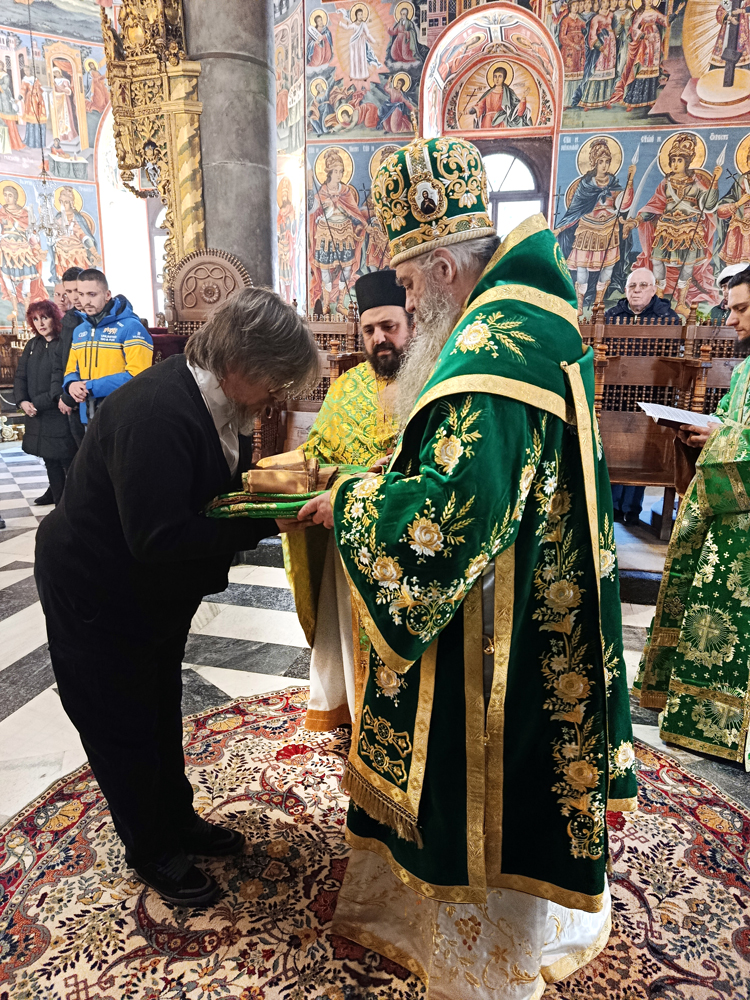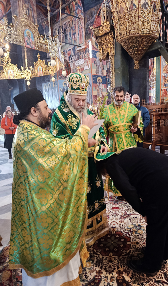 Днес, Неделя Вайя, тържествената богослужба в Рилската света обител бе предстоявана от игумена Адрианополския епископ Евлогий, в съслужение с братството на манастира.
